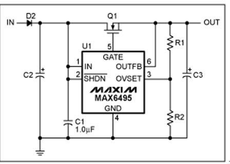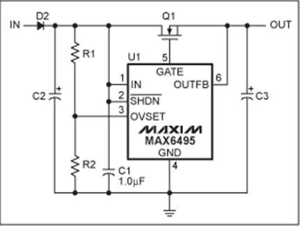 MAX6495–MAX6499/MAX6397/MAX6398過壓保護(OVP)器件用于保護后續(xù)電路免受甩負載或瞬間高壓的破壞。器件通過控制外部串聯(lián)在電源線上的n溝道MOSFET實現(xiàn)。當電壓超過用戶設置的過壓門限時,拉低MOSFET的柵極,MOSFET關斷,將負載與輸入電源斷開。