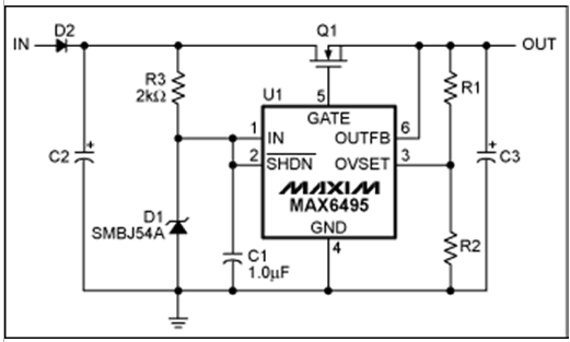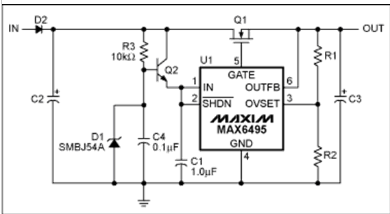 過壓保護(OVP)器件數(shù)據(jù)資料中提供的典型電路可以滿足大多數(shù)應用的需求(圖1)。然而,有些應用需要對基本電路進行適當修改。本文討論了兩種類似應用:增大電路的最大輸入電壓,在過壓情況發(fā)生時利用輸出電容存儲能量。