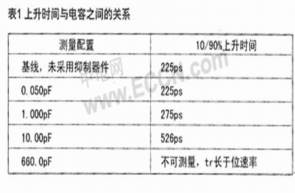 通常,USB 2.0支持480Mbps(bits per second)的數(shù)據(jù)傳輸;DVI和HDMI協(xié)議更是分別支持高達(dá)8Gbps和5Gbps的數(shù)據(jù)傳輸帶寬。在USB2.0、DVI和HDMI的高速數(shù)據(jù)率下,傳統(tǒng)保護(hù)裝置的寄生電容可能破壞信號(hào)的完整性或令其失真。失真表現(xiàn)為由較慢的上升和下降時(shí)間所致的高態(tài)/低態(tài)瞬變的前沿和后沿被修圓。上升和下降時(shí)間較慢會(huì)給系統(tǒng)帶來(lái)一些問(wèn)題,其中最重要的是時(shí)序問(wèn)題。電路在特定的時(shí)間需要穩(wěn)定的"高"態(tài)和"低"態(tài)。隨著各狀態(tài)之間過(guò)渡時(shí)間的增加,電路有可能檢測(cè)到不完整的過(guò)渡期,從而將數(shù)據(jù)誤差引入系統(tǒng)。附表1是不同寄生電容ESD抑制器件對(duì)數(shù)據(jù)上升沿時(shí)間(10%至90%高電平)所造成的影響比較。