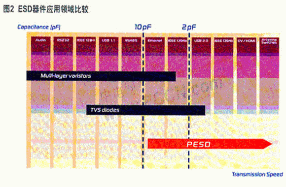 低電容ESD保護(hù)對(duì)于高速條件下保持?jǐn)?shù)據(jù)的完整性是非常關(guān)鍵的。在常見(jiàn)的瞬間過(guò)電壓抑制器件中,金屬氧化物壓敏電阻(MOV)和多層壓敏電阻(MLV)因價(jià)廉物美而應(yīng)用廣泛。但其固有的高電容決定了其應(yīng)用范圍只能局限于低頻領(lǐng)域和電源的瞬間電壓抑制上。而硅類(lèi)ESD防護(hù)器件,包括齊納二極管、TVS二極管/陣列等,雖然具有保護(hù)電壓低而準(zhǔn)確的優(yōu)點(diǎn),其寄生電容依舊不可忽視,通常難以適用于高速數(shù)據(jù)通訊接口,如HDMI、IEEE1394等。