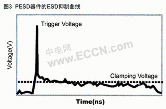 為滿(mǎn)足高速數(shù)據(jù)通訊接口既ESD保護(hù)有效、又不影響高速信號(hào)傳輸?shù)囊?。近年?lái),市場(chǎng)上推出了多種專(zhuān)門(mén)適用于此類(lèi)保護(hù)要求的器件。其中以瑞侃電路保護(hù)部門(mén)(RCP:RaychemCircuit Protection)推出的PESD器件為代表。該器件的電容極低(通常0.25pF),漏電流極小(<0.001 A);ESD防護(hù)快速有效(響應(yīng)曲線(xiàn)如圖3所示,觸發(fā)電壓典型值為150~250V;響應(yīng)時(shí)間少于1 ns);價(jià)格低于低電容硅器件。因此,在高速數(shù)據(jù)傳輸條件下,PESD器件擁有更佳的保護(hù)應(yīng)用特性。該器件已成功應(yīng)用于HDMI1.3和USB2.0等多種高速接口電路。