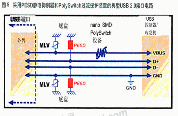 圖4、圖5和圖6展示了利用瑞侃電路保護(hù)部門(mén)PESD器件對(duì)HDMI1.3、USB2.0和IEEE1394接口電路進(jìn)行保護(hù)的典型應(yīng)用。這些保護(hù)將ESD與敏感電路隔離。在傳輸線(xiàn)路脈沖(TLP) 測(cè)試和IEC61000-4-2測(cè)試中,尤其是經(jīng)過(guò)多次采樣(1000次TLP測(cè)試)后,其性能要比其他可比較的元件好。相對(duì)于其他典型的聚合物ESD防護(hù)器件,這類(lèi)PESD器件的較低觸發(fā)電壓(通常150V)和低箝位電壓(通常25V)能更好的幫助保護(hù)敏感電子元件。該器件采用電子工業(yè)中最流行的0603和0402貼裝形式,符合RoHS的嚴(yán)格要求;幫助機(jī)頂盒敏感電路、手提電腦、手機(jī)和其它便攜式設(shè)備免ESD侵害。