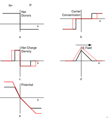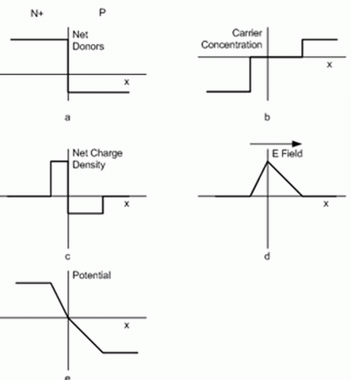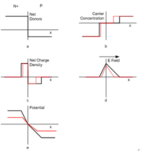 二極管的特性可以通過(guò)如圖1所示的突變型PN結(jié)來(lái)做深入理解。考慮到兩片硅材料,一片是重?fù)搅耸┲麟s質(zhì)的n+硅,一片是輕摻了受主雜質(zhì)的p硅。如圖1a所示那樣我們?cè)趚=0處將它們結(jié)合。n+區(qū)域電子密度等于施主雜質(zhì)的數(shù)目,而P區(qū)域認(rèn)為空穴密度等于受主雜質(zhì)濃度,但這種靜態(tài)情況將不會(huì)持續(xù)。在PN結(jié)邊界處電子將和空穴重新結(jié)合,結(jié)果是導(dǎo)致在PN結(jié)連接處的區(qū)域電子和空隙全被耗空。這就是圖1b所示的耗盡層,或者說(shuō)是零載流子濃度區(qū)域。在這個(gè)連接處區(qū)域隨著載流子濃度的耗盡就成為靜電荷區(qū)域,如圖1c。在橫坐標(biāo)零點(diǎn)左邊,由于電子和右邊的空穴中和從而只剩下帶正電的靜電荷;在零點(diǎn)右邊,由于空穴和左邊的電子中和從而只剩下帶負(fù)電的靜電荷。在PN結(jié)連接處的兩邊耗盡區(qū)的寬度依賴于兩邊施主雜質(zhì)和受主雜質(zhì)各自的摻雜濃度。有個(gè)物理現(xiàn)象是PN結(jié)耗盡區(qū)總的正電荷數(shù)和負(fù)電荷數(shù)一樣,所以PN總體還是呈現(xiàn)不帶電狀態(tài)。 PN結(jié)連接處摻雜濃度高的一邊的耗盡層寬度比摻雜濃度低的一邊要窄得多。 耗盡區(qū)一定的靜電荷密度的存在產(chǎn)生了一個(gè)電場(chǎng),其場(chǎng)強(qiáng)最大的地方是PN結(jié)連接處,如圖1d所示。PN結(jié)的電場(chǎng)存在產(chǎn)生了內(nèi)建電壓差,如圖1e所示。電場(chǎng)和電壓的存在會(huì)迫使電子向n區(qū)域移動(dòng),而空穴向p區(qū)移動(dòng)。
