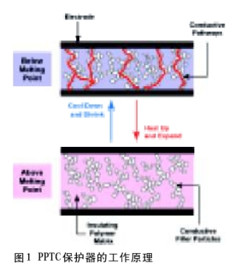 保護(hù)繼電器的一個(gè)常用元件是高分子聚合物正溫度系數(shù)(PPTC)自復(fù)過(guò)流保護(hù)器(見(jiàn)圖1)。 它是用碳黑這種導(dǎo)電性填料做成的。在這個(gè)元件中碳黑構(gòu)成網(wǎng)狀導(dǎo)電通路。在正常的情況下,PPTC保護(hù)器呈現(xiàn)低電阻,但是,在PPTC保護(hù)器中流過(guò)的電流過(guò)大時(shí),它的溫度升高,結(jié)晶狀聚合物變成非結(jié)晶狀態(tài)。這個(gè)轉(zhuǎn)變引起聚合物膨脹,使得導(dǎo)電性聚合物內(nèi)的網(wǎng)狀導(dǎo)電通路斷開(kāi)。這個(gè)變化引起它的電阻急劇上升。由于電阻增大,于是保護(hù)器中流過(guò)的電流便下降到很小。PPTC保護(hù)器保持這個(gè)狀態(tài),直到故障被排除。一旦把故障排除了,保護(hù)器的溫度下降,碳黑形成的導(dǎo)電通路恢復(fù),它又回到低電阻狀態(tài)。可以不使用PPTC 保護(hù)器而用傳統(tǒng)的熔斷器來(lái)保護(hù)繼電器。不過(guò),在使用熔斷器的情況下,每當(dāng)發(fā)生故障,就需要更換熔斷器。PPTC保護(hù)器的主要優(yōu)點(diǎn)在于它具有自復(fù)功能,從而可以減少昂貴的服務(wù)費(fèi)用和保修費(fèi)用。
