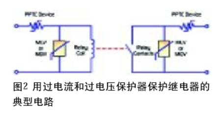 圖2是保護(hù)繼電器的一種典型電路。PPTC保護(hù)器是是與繼電器繞組串聯(lián)著,在出現(xiàn)故障或者發(fā)生意外的過(guò)載時(shí),它限制繼電器中流過(guò)的電流。這個(gè)圖中,還有一個(gè) PPTC保護(hù)器與繼電器的觸點(diǎn)串聯(lián)著,它起的作用與保護(hù)繼電器繞組是一樣的。在選擇PPTC保護(hù)器時(shí),很重要一點(diǎn)是它的額定電壓要等于或高于預(yù)期的最高電壓。還要求保護(hù)器的保持電流必須等于或大于正常運(yùn)作時(shí)的最大穩(wěn)定狀態(tài)電流。此外,還要考慮到最高環(huán)境溫度,這是因?yàn)殡S著環(huán)境溫度上升,保持電流下降。