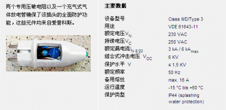 兩個(gè)專用壓敏電阻以及一個(gè)充氣式氣體放電管確保了該插頭的全面防護(hù)功能,這些元件均來自愛普科斯。
