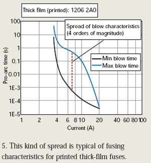 源于這種阻值變化,芯片保險絲可能在正常浪涌電流條件下熔斷?;蚍催^來說,它也可能在過載條件下需要熔斷時而沒能熔斷。當(dāng)然,這是工程師必須避免的最壞情況。圖5顯示了印刷厚膜保險絲熔斷特性的典型擴(kuò)散。