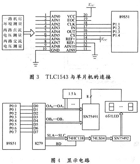 直流電壓、交流電壓以及機房溫濕度的測量選用TLC1543,TLC1543為10位11通道的A/D轉(zhuǎn)換器,與單片機的連接如圖3所示。機房環(huán)境測量(溫度、濕度)采用JWS溫濕度變送器,輸出信號為標準0~5V直流電壓信號;直流電壓的數(shù)據(jù)采集經(jīng)電阻分壓后直接送至A/D轉(zhuǎn)換器,交流電壓的采集經(jīng)分壓整流后也直接送至A/D轉(zhuǎn)換器。