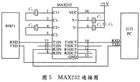 為了滿足數(shù)據(jù)傳輸距離大于200m,通信采用75LBC180全雙工485芯片,單片機通信電平和計算機電平的轉(zhuǎn)換采用MAX232完成,如圖5所示。MAX232芯片是專為電腦的RS232標準串口設(shè)計的接口電路,使用+5V單電源供電。另外。RS232到RS485的轉(zhuǎn)換可采用專用的轉(zhuǎn)換器,如BOK-60或ATC-160A無源轉(zhuǎn)換器。