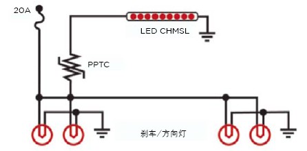 發(fā)光二極管(LED)所具有的低功耗和設(shè)計靈活性使其在照明電路中的應(yīng)用日益普及,包括中置高位剎車燈(CHMSL)。在這種應(yīng)用中用LED取代白熾燈的好處在于,能使用小規(guī)格低電流導(dǎo)線方便地在車頂內(nèi)襯和靠近鉸鏈處不容易彎曲的連接中輕松地進行布線,如圖6所示。采用PolySwitch器件和分散式架構(gòu)保護LED CHMSL照明應(yīng)用提高了設(shè)計靈活性,減少了導(dǎo)線數(shù)量和重量并提高了可靠性。