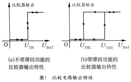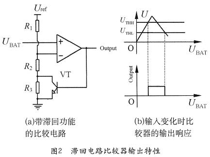 但如果在比較電路中設置兩個門限電壓:UTHH和UTHL(UTHH>UTHL),則可以形成一個滯回區(qū),如圖1(b)所示。當電池電壓從低升高至UTHH時,比較器輸出高電平,打開電子開關,給負載供電;當電池電壓降低至UTHL時,比較器輸出低電平,斷開負載。這個時候電池端電壓雖然會迅速升高至UTHL以上,但由于達不到UTHH,所以,比較器仍然輸出低電平,負載仍被斷開,直到電池被充電后電壓升高至UTHH以上才能再次接通負載。這樣就避免了電路的振蕩,保護了負載和電池。
