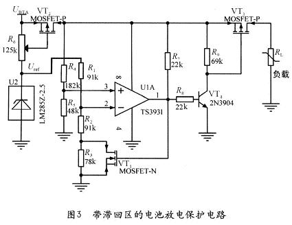 圖3是具體的硬件電路圖,參考電壓由LM285Z一2.5分流穩(wěn)壓器產(chǎn)生,它最低只需要10μA的通過電流就可輸出穩(wěn)定的2.5V參考電壓,這可大大降低電池在低壓閉鎖狀態(tài)的功耗。比較器選用了ST公司TS393I,它是一種微功耗比較器,這樣,所有分壓電阻的阻值可以選的很大,進一步降低了功耗。比較器的輸出控制P溝道的MOSFET、VT3接通或斷開負載。當電池電壓降低到一定程度時VT2關斷,使得由比較器組成的保護電路與電池斷開,極大地減小的電池的能量消耗,電池處于一種近似自然放電的狀態(tài);當電池電壓恢復時,VT2自然導通,保護電路重新恢復工作。