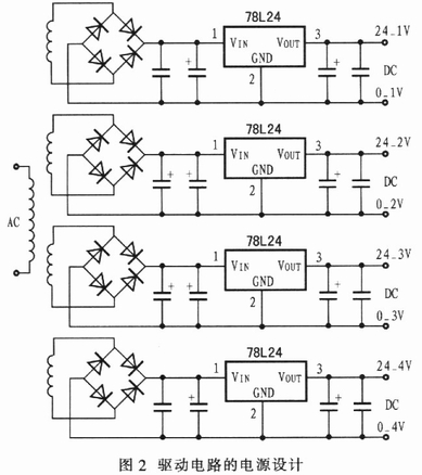 驅(qū)動電路需要4路相互隔離的直流電源為4路IGBT驅(qū)動電路供電,用220V/22V變壓器對4路交流電源分別整流,用電容器和78L24型電壓調(diào)整器穩(wěn)壓后輸出4路24V直流電壓,如圖2所示。