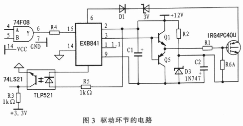 筆者在實(shí)驗(yàn)中采用的是EXB841型專用IGBT驅(qū)動模塊,其最高運(yùn)行頻率為40kHz,輸入信號經(jīng)內(nèi)部光耦隔離,光隔驅(qū)動電流為10mA,最大延時(shí)約為1μs。工作溫度范圍為-10℃~+85℃,供電電壓為+20V~+25V。筆者對EXB841功能進(jìn)行了擴(kuò)展,圖3為驅(qū)動環(huán)節(jié)電路。