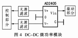 控制電路為弱電部分,極易受到干擾;驅(qū)動電路直接與外電路連接,是一個(gè)較強(qiáng)的干擾源;為了實(shí)現(xiàn)整個(gè)設(shè)備的電磁兼容,控制電路部分必須與驅(qū)動部分隔離。為了避免公共電源對控制電路產(chǎn)生干擾,應(yīng)對控制電路及驅(qū)動電路分別供電,EXB84l的電源電壓為+20V,一般控制電路的供電電壓為5V,因此,可以利用圖4所示的DC-DC微功率模塊進(jìn)行電源隔離,采用A2405D型微功率模塊實(shí)現(xiàn)電源的隔離。