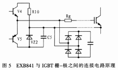 圖5所示為EXB841與IGBT柵-射極之間的連接電路原理圖。當(dāng)驅(qū)動電路中的V4導(dǎo)通時(shí),IGBT處于正常導(dǎo)通狀態(tài),當(dāng)V5導(dǎo)通時(shí),IGBT柵-射極之間通過穩(wěn)壓管VZ2提供一個(gè)-5V電壓加在其兩端,使IGBT關(guān)斷,此時(shí)V5處于臨界導(dǎo)通狀態(tài),穩(wěn)壓管VZ2處于反向偏置狀態(tài)。但由于集-柵極之間分布電容的影響,集-柵極之間的du/dt增大時(shí),其通過分布電容形成的電流經(jīng)過,所以,要克服集-柵極之間的du/dt,確保穩(wěn)壓管不過壓,避免IGBT誤導(dǎo)通??朔u/dt的方法有二種:一是驅(qū)動電路輸出與IGBT柵-射極之間的連線采用雙絞屏蔽電纜,屏蔽層接地,二是采用快速吸收電路吸收過電壓。