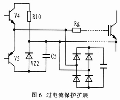 在實(shí)際應(yīng)用中,僅靠EXB841的6引腳檢測IG-BT集電極電壓來實(shí)現(xiàn)過流保護(hù)并不足以有效地保護(hù)IGBT,因此有必要在主電路中加接霍爾電流傳感器來檢測電路中的過流,如圖6所示。過流發(fā)生后,檢測電路檢測到電流,延時(shí)8μs后信號還存在的話。封鎖驅(qū)動信號以關(guān)斷IGBT。在圖中,霍爾電流傳感器如果在主電路中檢測到過流信號,其中的PNP三極管將導(dǎo)通,同時(shí),NPN三極管被截止,EXB841的6腳被懸空;當(dāng)沒有過流信號時(shí),PNP三極管不導(dǎo)通,NPN三極管導(dǎo)通,此時(shí)電路等效于擴(kuò)展前的電路。