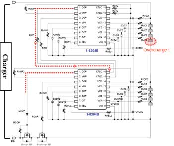下面,詳細(xì)介紹一下保護(hù)芯片級聯(lián)的具體工作情況。還是以S-8204B為例,其CTLC端子可由芯片外部控制COP端子的輸出電壓、而CTLD端子則可由芯片外部控制DOP端子的輸出電壓。通過CTLC端子以及CTLD端子可以分別單獨(dú)控制COP端子與DOP端子的輸出電壓。并且,這些控制功能優(yōu)先于芯片內(nèi)部的電池充放電保護(hù)功能。如果8節(jié)電池中的某一節(jié)電池發(fā)生過充,與該電池相連接的S-8204B的COP端子輸出電壓會(huì)發(fā)生變化,該電壓變化會(huì)傳遞到與其相連接的另一個(gè)S-8204B的CTLC端子,使得另一個(gè)S-8204B的COP端子輸出電壓也發(fā)生變化,從而控制充電控制用MOSFET關(guān)斷,實(shí)現(xiàn)鋰離子電池的過充電保護(hù)。