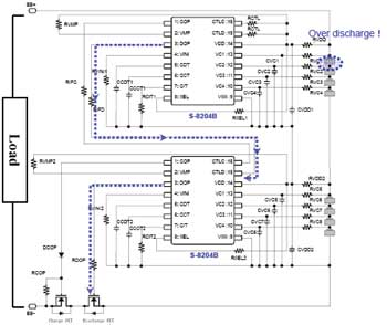 單體鋰離子電池的額定電壓為3.6V,不能滿足高電壓供電場合的需要,因此就需要多節(jié)鋰離子電池串聯(lián)使用。為此,各有關(guān)電源管理控制集成電路生產(chǎn)廠商紛紛推出了自己的多節(jié)鋰離子電池(電池組)保護(hù)集成電路芯片,如精工技術(shù)有限公司(SII)的S-8204B(S-8204B隸屬于S-8204系列,該系列的另一個(gè)產(chǎn)品是S-8204A。兩者的區(qū)別是S-8204A配合P溝道MOSFET工作,S-8204B則配合N溝道MOSFET工作)。這類產(chǎn)品的特點(diǎn)是監(jiān)控3、4節(jié)鋰離子電池的充放電狀態(tài),可實(shí)現(xiàn)過充、過放和過電流保護(hù)。