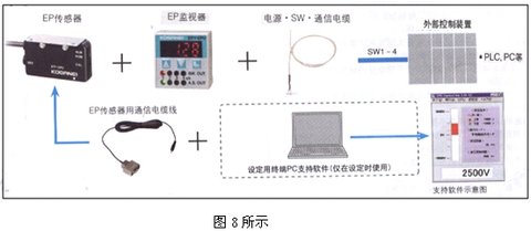 從圖8可知,通過(guò)電腦進(jìn)行設(shè)定的EP監(jiān)視器連接是由外部控制裝置與電腦及其組件構(gòu)成。而組件必需是EP傳感器1臺(tái)(如DTY-EPS型)與EP監(jiān)視器1臺(tái)(如DTY-EPU)及電源SW•通信電纜線.及EP傳感器用通信電纜線。