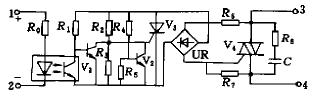 過零觸發(fā)型AC—SSR為四端器件,其內(nèi)部電路如圖1所示。1、2為輸入端,3、4為輸出端。R0為限流電阻,光耦合器將輸入與輸出電路在電氣上隔離開,V1構(gòu)成反相器,R4、R5、V2和晶閘管V3組成過零檢測電路,UR為雙向整流橋,由V3和UR用以獲得使雙向晶閘管V4開啟的雙向觸發(fā)脈沖,R3、R7為分流電阻,分別用來保護V3和V4,R8和C組成浪涌吸收網(wǎng)絡(luò),以吸收電源中帶有的尖峰電壓或浪涌電流,防止對開關(guān)電路產(chǎn)生沖擊或干擾。