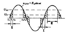 要指出的是所謂“過零”并非真的必須是電源電壓波形的零處,而一般是指在10~25V或-(10~25)V區(qū)域內(nèi)進行觸發(fā),如圖2所示。圖中交流電壓分三個區(qū)域,Ⅰ區(qū)為-10V~+10V范圍,稱為死區(qū),在此區(qū)域中加入輸入信號時不能使SSR導(dǎo)通。Ⅱ區(qū)為10~25V和-(10~25)V范圍,稱為響應(yīng)區(qū),在此區(qū)域內(nèi)只要加入輸入信號,SSR立即導(dǎo)通。Ⅲ區(qū)為幅值大于25V的范圍,稱為抑制區(qū)在此區(qū)域內(nèi)加入輸入信號,SSR的導(dǎo)通被抑制。