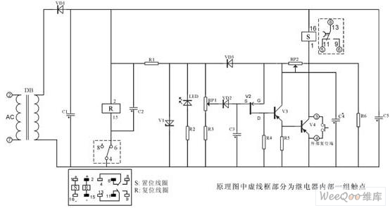 該電路核心部分由IC4541構(gòu)成,延時(shí)設(shè)定由RP2、C*設(shè)定,A-B端根據(jù)需求接相應(yīng)高、低電平(設(shè)定端)內(nèi)部2繞組閉鎖繼電器采用DC12V(因繼電器工作電壓與IC4060組成延時(shí)電器要低,則為保證其驅(qū)動(dòng)則分別由V6、V7、V1、V3構(gòu)成)。其中C2為二次儲(chǔ)能器件,可根據(jù)延時(shí)的長(zhǎng)短予以調(diào)整,C4為完成S置位線圈工作。