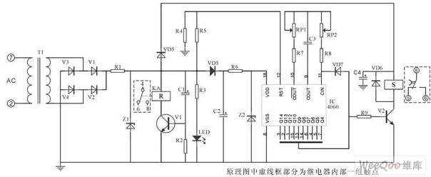 集成CD4060構(gòu)成的延時(shí)電路示于圖3。該電路核心延時(shí)由CD4060構(gòu)成,延時(shí)設(shè)定由RP1與配置的C3來(lái)設(shè)定。內(nèi)部2繞組閉鎖繼電器采用DC24V(采用較高工作電壓的繼電器,可降低其驅(qū)動(dòng)電流,使驅(qū)動(dòng)部分較為簡(jiǎn)單)。端加入工作電源,V1三極管工作,使其R復(fù)位線圈吸合工作,內(nèi)部觸點(diǎn)回至原始狀態(tài)。C2、C4完成充電工作。