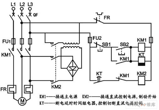 制動(dòng)過(guò)程:按下停止按鈕SB1→KM1斷電,KM1主觸點(diǎn)斷開(kāi),電機(jī)脫離電源,KM1輔助常閉觸點(diǎn)恢復(fù)閉合,KM2通電,接入直流電源,制動(dòng)開(kāi)始,同時(shí)KM1輔助常開(kāi)觸點(diǎn)又恢復(fù)斷開(kāi),則KT線圈呈斷電狀態(tài),延時(shí)開(kāi)始,待所設(shè)延時(shí)時(shí)間到達(dá)后,KT的延時(shí)斷開(kāi)常開(kāi)觸點(diǎn)恢復(fù)斷開(kāi),KM2失電,切斷直流電源,制動(dòng)結(jié)束。
