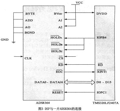 TMS320LF4207A本身雖然自帶A/D轉(zhuǎn)換器,但其轉(zhuǎn)換精度只有10位,且轉(zhuǎn)換速度也不高(500ns)。為了實(shí)現(xiàn)更高的速度和精度,選擇了擴(kuò)展ADS8364芯片。ADS8364是一種高速、低功耗、雙16bA/D轉(zhuǎn)換器,有6個(gè)模擬量輸入通道??捎肂VDD獨(dú)立供電。它有6個(gè)完全相同的采樣保持電路,分成A、B、C3組,每一組都由1個(gè)HOLD引腳控制。ADS8364可以從外部引入最大5MHz的時(shí)鐘頻率,此時(shí)采樣時(shí)間是0.8μs,轉(zhuǎn)換時(shí)間只有3.2μs,A/D的最大采樣率達(dá)到250K,要達(dá)到此值,可在下一次轉(zhuǎn)換開(kāi)始時(shí)讀取上一次的轉(zhuǎn)換結(jié)果。此A/D完全可以滿足本裝置的采樣要求。AD芯片與DSP的連接如圖3所示。