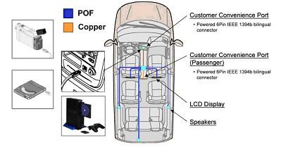 如圖所示,車載網(wǎng)絡(luò)的架構(gòu)可分為內(nèi)嵌式網(wǎng)絡(luò)和用戶便利端口(CCP)。目前的技術(shù)規(guī)格將內(nèi)嵌式塑料光纖(POF)車載網(wǎng)絡(luò)定義為與現(xiàn)有的MOST(媒體定向系統(tǒng)傳輸)技術(shù)相似的規(guī)格。但是,前者的架構(gòu)更加穩(wěn)固、能夠提供更高的數(shù)據(jù)傳輸速率,并且更易于實(shí)現(xiàn)。這個(gè)網(wǎng)絡(luò)能夠連接各種電子設(shè)備,例如DVD播放機(jī)、視頻顯示屏、導(dǎo)航系統(tǒng)、收音機(jī)接收設(shè)備、通訊設(shè)備,如無(wú)線電話或應(yīng)急自動(dòng)遠(yuǎn)程通信及信息處理技術(shù)術(shù)語(yǔ),以及其它的多媒體應(yīng)用。