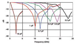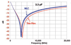 薄膜電容器(如圖1所示)還具有一項(xiàng)前面沒有提及的性能優(yōu)勢:它的響應(yīng)只有1個(gè)諧振點(diǎn),因?yàn)檫@種器件使用單絕緣層設(shè)計(jì)封裝成多層陶瓷電容器(MLCC)。圖2顯示了這種薄膜電容器的部分S21前向傳輸損耗特性曲線。
