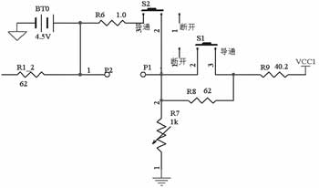 根據(jù)鋰電池保護(hù)IC的工作原理設(shè)計(jì)的測試電路如圖2所示,圖3詳細(xì)說明了圖2中模塊B的電路。模塊A在測試過流保護(hù)時為CS引腳提供電壓,模擬圖1中的CS引腳所探測到的電壓。調(diào)整模塊中的可變電位器可為CS引腳提供可變電源,控制其中的跳變開關(guān)可為CS提供突變電壓。模塊B為電源,模擬為IC提供工作電壓。調(diào)整電路中的可變電位器R7可為整個電路提供一個可變電壓,在測試過充電保護(hù)電壓和過放電保護(hù)電壓時使用??刂颇K中的開關(guān)S1的閉合為測試電路提供一個跳變電源,在測試IC的過充、過放和過流延遲時使用。