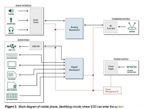 由于手機(jī)的設(shè)計(jì)對象是大眾消費(fèi)者,而且可在任何環(huán)境中使用,因此ESD很有可能會(huì)進(jìn)入其中的一個(gè)端口或I/O接口,并導(dǎo)致芯片組出現(xiàn)電氣不穩(wěn)定現(xiàn)象或完全損壞。圖2用于幫助說明不同電路該用什么樣的ESD保護(hù)技術(shù)。它表明,所有的電路都有可能為ESD進(jìn)入手機(jī)提供一個(gè)途徑。