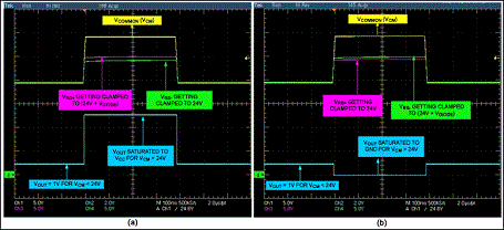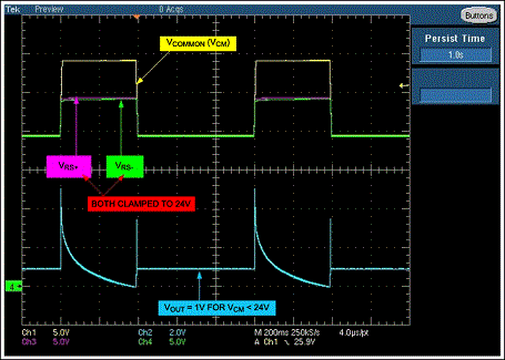 圖2是當(dāng)移走D1時,35V拋負載脈沖下放大器的輸出。施加電壓為電池標(biāo)稱電壓,所要求的輸出電壓為1V(輸入VSENSE=50mV、增益=20)。出現(xiàn)拋負載電壓時,齊納管把輸入共模電壓鉗位在大約24V,放大器輸出經(jīng)過幾個短暫的波動后穩(wěn)定到0V。