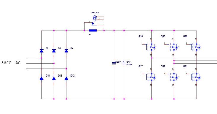 大家可以看出圖上標出15KW的地方,就是我們的繼電器應(yīng)用的地方,一般在15KW以下的變頻器上的保護工作都是由繼電器來完成的,大于15KW的變頻器都是用接觸器來保護的,繼電器主要完成的作用為,大家知道當電機啟動會有一個很大的沖擊電流,為了對變頻器進行保護,先用繼電器把這個大的沖擊電流擋住,也就是繼電器處于常開狀態(tài),等電流恢復(fù)到正常,繼電器關(guān)閉,把那個電阻短路,所以此處的繼電器一般都是需要電流比較大的,例如omron的G8P型繼電器,由于此處繼電器對電機有比較重要的作用,所以一般客戶都會選擇質(zhì)量較好的繼電器,有用OEG的,有泰科的,也有松川的。如果在15KW以上的變頻器,一般客戶不會選擇用繼電器來保護,由于沖擊電流太大,一般客戶會選擇接觸器來保護,但是接觸器的價格要比繼電器貴的多。還有一個地方,就是變頻器上都會有給客戶留的無源觸點,這個地方會用繼電器當開關(guān)使用。