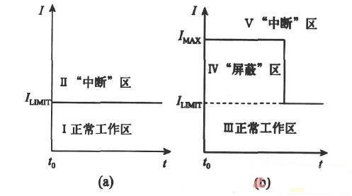 當(dāng)負(fù)載電流超過(guò)限制電流ILIMIT 不太多且持續(xù)作用時(shí)間不太長(zhǎng)時(shí),我們希望過(guò)流保護(hù)電路能保持LDO 不中斷工作,因此需要采用“屏蔽”模式屏蔽掉部分可以讓LDO 不中斷運(yùn)行的過(guò)流信號(hào),對(duì)于過(guò)流幅值和持續(xù)作用時(shí)間超過(guò)范圍的過(guò)流信號(hào),過(guò)流保護(hù)電路又能采取中斷LDO 工作的模式。傳統(tǒng)的“中斷”模式電流保護(hù)電路工作狀態(tài)如圖1(a)所示,分為正常工作區(qū)Ⅰ和“中斷”區(qū)Ⅱ,當(dāng)負(fù)載電流不超過(guò)ILIMIT 時(shí),LDO 工作在正常工作區(qū),當(dāng)負(fù)載電流超過(guò)ILIMIT 時(shí)LDO 進(jìn)入“中斷”區(qū)。加入“屏蔽”模式后的過(guò)流保護(hù)電路工作狀態(tài)如圖1(b),分為正常工作區(qū)Ⅲ、屏蔽區(qū)Ⅳ以及中斷區(qū)Ⅴ,當(dāng)負(fù)載電流小于ILIMIT 時(shí),LDO 處于正常工作區(qū),當(dāng)過(guò)流信號(hào)的幅值在ILIMIT 和最大幅值電流IMAX 之間,持續(xù)作用時(shí)間在t=tMAX 之內(nèi)即同時(shí)滿(mǎn)足ILIMIT ≤ ILOAD ≤ IMAX,t ≤tMAX 時(shí),LDO 進(jìn)入屏蔽區(qū),這個(gè)范圍之外的過(guò)流信號(hào)將進(jìn)入中斷區(qū)。對(duì)比圖1(a)和(b)可以看出,改進(jìn)過(guò)流保護(hù)電路后的LDO 的正常工作區(qū)包括圖1(b)的正常工作區(qū)Ⅲ和“屏蔽”區(qū)Ⅳ,增大了工作區(qū)的范圍,提高了LDO 的工作效率。