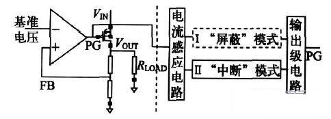 包含過(guò)流保護(hù)電路的LDO整體框圖如圖2所示,虛線(xiàn)左邊是LDO 主體電路,包括誤差放大器、功率管、負(fù)載電阻以及分壓電阻。虛線(xiàn)右邊部分為電流保護(hù)電路,主要作用是感應(yīng)并檢測(cè)負(fù)載電流是否超過(guò)限制電流,然后通過(guò)控制功率管來(lái)決定是否使LDO 中斷運(yùn)行,包括電流感應(yīng)電路和控制電路。傳統(tǒng)的過(guò)流保護(hù)電路只采用圖2 中實(shí)框Ⅱ所示的“中斷”模式(不包括虛框),對(duì)于任何負(fù)載過(guò)流情況,不論持續(xù)作用時(shí)間如何,都使LDO 中斷工作;本文在傳統(tǒng)的“中斷”模式基礎(chǔ)上,增加了“屏蔽”模式(如圖2 中虛框Ⅰ),能有效屏蔽希望LDO不中斷工作的過(guò)流信號(hào),使LDO更高效運(yùn)行,同時(shí)保留“中斷”模式,保證LDO 安全工作。