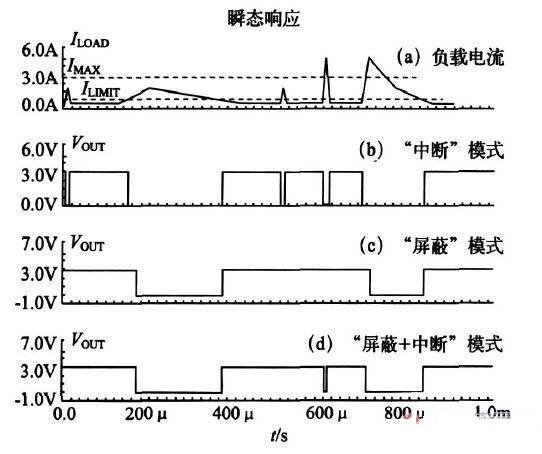 圖5(b)表示“中斷”模式在所有過(guò)流情況時(shí)都會(huì)關(guān)斷LDO。圖5(c)的“屏蔽”模式能屏蔽tMAX內(nèi)的過(guò)流信號(hào),但同時(shí)也屏蔽了過(guò)流幅值超過(guò)IMAX的電流信號(hào),只有在過(guò)流持續(xù)作用時(shí)間大于tMAX 時(shí),LDO 才被關(guān)斷。圖5(d)的“屏蔽+ 中斷”模式下,電路只在過(guò)流信號(hào)持續(xù)作用時(shí)間小于tMAX 而且幅值不超過(guò)IMAX 時(shí)屏蔽掉過(guò)流信號(hào),對(duì)于其他超過(guò)ILIMIT的過(guò)流信號(hào),都將中斷LDO 運(yùn)行。通過(guò)比較圖5 的(b)、(c)和(d)曲線(xiàn)可以得到,相對(duì)于圖5(b)的“中斷”模式,圖5(d)的“屏蔽+ 中斷”模式擴(kuò)大了工作區(qū)范圍,又比圖5(c)的“屏蔽”模式保護(hù)電路更安全。傳統(tǒng)屏蔽電路都會(huì)在過(guò)流之后關(guān)斷LDO,我們希望在某些短時(shí)且小幅度過(guò)流信號(hào)下LDO 仍能正常運(yùn)行。結(jié)果表明,設(shè)計(jì)后的過(guò)流保護(hù)電路能達(dá)到預(yù)期效果,保證系統(tǒng)更高效安全地運(yùn)行。