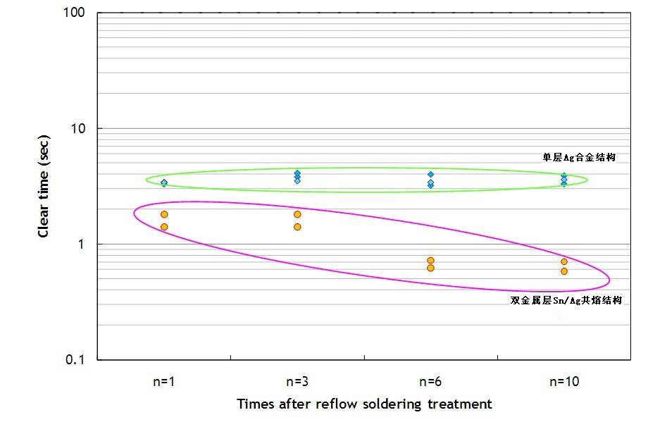 單層Ag合金結(jié)構(gòu)的保險(xiǎn)絲即使經(jīng)過多次高溫?zé)崽幚?,仍可以維持較穩(wěn)定的熔斷時(shí)間。但是雙層Sn/Ag共熔結(jié)構(gòu)的保險(xiǎn)絲,其熔斷時(shí)間有明顯變快的趨勢。