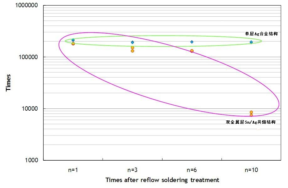 單層Ag合金結(jié)構(gòu)的保險(xiǎn)絲即使經(jīng)過多次高溫?zé)崽幚恚钥梢跃S持一定的耐脈沖能力,承受脈沖次數(shù)都可達(dá)十萬次以上。但是雙層Sn/Ag共熔結(jié)構(gòu)的保險(xiǎn)絲,其承受脈沖能力有明顯下降的趨勢,在經(jīng)過10次回流焊錫爐熱處理后,承受脈沖次數(shù)就會(huì)下降到十萬次以下。