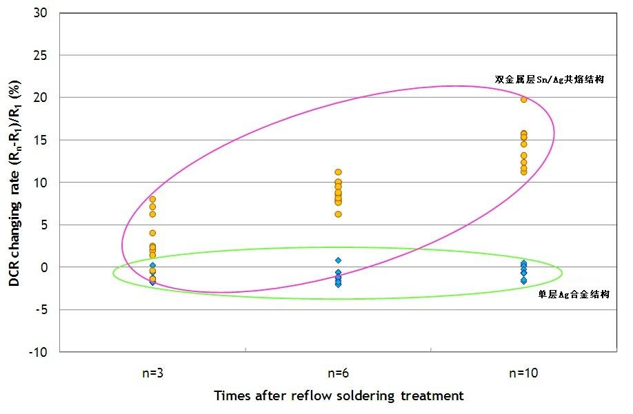 單層Ag合金結(jié)構(gòu)的保險(xiǎn)絲即使經(jīng)過多次高溫?zé)崽幚恚淅渥杩棺兓苄?。但是雙層Sn/Ag共熔結(jié)構(gòu)的保險(xiǎn)絲,其冷阻抗有明顯變高的趨勢(約升高10~20%),且變異也較大。