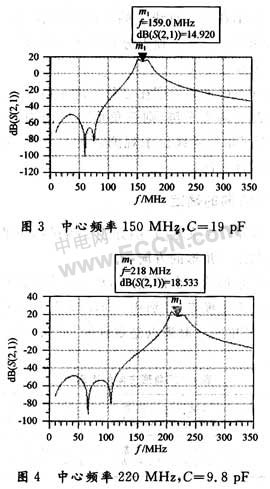 通常,電調(diào)諧濾波采用雙極點(diǎn)調(diào)諧濾波,諧振回路分為串聯(lián)諧振回路和并聯(lián)諧振回路,通過(guò)電感或電容進(jìn)行耦合。此電調(diào)濾波器采用的是并聯(lián)諧振回路,用電感進(jìn)行耦合。在進(jìn)行仿真之前,需要建立仿真模型和設(shè)計(jì)各種參數(shù)?;谝陨夏P停肁DS軟件對(duì)電調(diào)濾波器進(jìn)行電路設(shè)計(jì)和仿真。由于系統(tǒng)要求對(duì)該電調(diào)濾波器進(jìn)行AGC控制,所以在仿真時(shí)加入雙柵FET。傳輸函數(shù)S21、頻率范圍設(shè)在10~350 MHz、電容在2.6~39 pF之間變化,仿真使用的放大器是NE25118。最終的ADS模型仿真結(jié)果如下面兩組曲線所示。若LC濾波器不使用放大器,仿真結(jié)果中可以看出濾波器的插損在2~3 dB左右。
