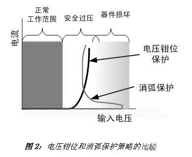 電壓箝位與消弧:電壓箝位器件的工作原理是從低電壓時(shí)的高阻抗轉(zhuǎn)換至高于導(dǎo)通電壓時(shí)的低阻抗,且沒(méi)有負(fù)阻抗區(qū)域(圖2)。這器件通過(guò)提供接地的低阻抗通道,對(duì)高于導(dǎo)通電壓的電壓進(jìn)行箝位。消弧(crowbar)器件在低電壓時(shí)也呈高阻抗,但當(dāng)電壓較高時(shí)觸發(fā)新的導(dǎo)通機(jī)制,使電流增大,并伴隨著電壓下降。因此,消弧器件擁有負(fù)阻抗區(qū)域。某些消弧器件的觸發(fā)電壓可能非常高。如果消弧TVS觸發(fā)器的速度足夠快,就可以經(jīng)常提供保護(hù),即便電壓已經(jīng)達(dá)到可能導(dǎo)致器件損壞的電平。消弧器件有時(shí)也稱作“驟回”器件,因?yàn)殡妷后E然下降。