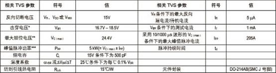表1:熱插拔電路TVS元件的規(guī)格和細(xì)節(jié)(Littelfuse5.0SMDJ15A)