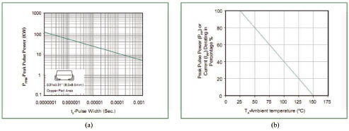 圖3 Littelfuse 5.0SMDJ15A TVS(a)峰值脈沖功率與脈沖持續(xù)時間,(b)熱降額特性