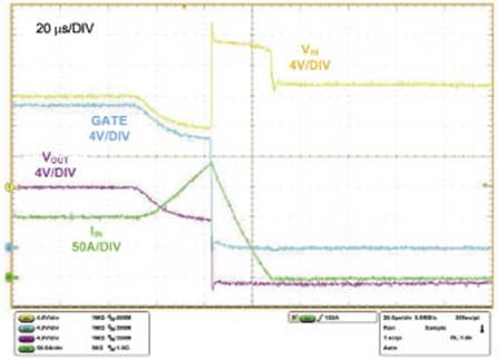 由于在檢測到故障之前允許建立起盡可能高的電流,圖1中電路的輸出兩端直接拉低的零阻抗短路尤其麻煩。在短路故障響應(yīng)時間之后,通路MOSFET最終是由“斷路器”故障條件下的熱插拔控制器命令關(guān)閉的,同時正向電流迅速被中斷。