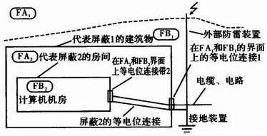 由圖2可以看出,該建筑物內(nèi)由外到內(nèi)按照順序劃分為:FA1為直擊雷的非防護區(qū);FB1為直擊雷防護區(qū);FA2則為第一防護區(qū);FB2為第二防護區(qū)。直擊雷非防護區(qū)FA1的劃分:該區(qū)域內(nèi)的各對象會承受直擊雷,流過全部電流,而雷電的電磁場并沒有衰減。該區(qū)其實是房屋頂部及上部沒有受到避雷網(wǎng)所保護的部分。直擊雷防護區(qū)FB1的劃分:該區(qū)域的各對象不會受到直擊雷的侵入,但是雷電的電磁場也未衰退,該區(qū)域為建筑物頂部及上部避雷網(wǎng)的保護部分,防雷措施所采用的是避雷網(wǎng)和接地裝置。第一防護區(qū)FA2,在該區(qū)域內(nèi)的各對象不會受到直擊雷的侵入,并且雷電流在該區(qū)域會有所分流,如果設(shè)置相應(yīng)的屏蔽,那么電磁場作用就會相應(yīng)地衰退,其實現(xiàn)代的鋼筋結(jié)構(gòu)從某種意義上來說就是一個屏蔽。由圖可以看出該區(qū)域其實位于房內(nèi),雷電流分散至各引下線。該區(qū)域主要的防雷措施就是等電位連接和浪涌防護器,其中等電位連接的位置就在FA1及FA2的交界,而浪涌防護器則接在FA2的入口。第二防護區(qū)FB2由圖可知其實際位于樓內(nèi)某防雷及防電流涌要求較高的監(jiān)控室內(nèi),如果雷電的電磁脈沖需要進一步減少,那么該區(qū)域就采用次級浪涌防護器以及機房屏蔽;如果仍需再做減少,則需要再劃分防雷分區(qū)。