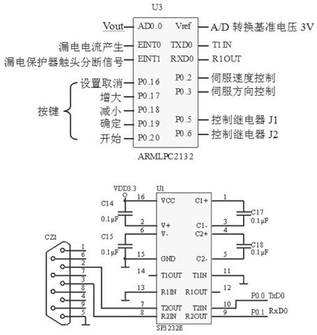 由于A/D轉(zhuǎn)換為10位,當(dāng)輸入電壓為5V時,輸出數(shù)據(jù)值為1024(4FFH),因此最大分辨率為0.0049V(5V/1024)。若產(chǎn)生測試電流的回路電阻為12Ω時,漏電電流的分辨率為0.4mA(0.0049V/12Ω),完全滿足測試需要。漏電保護器的漏電電流產(chǎn)生的開始信號和動、靜觸頭斷開信號分別送入LPC2132的外部中斷輸入端,采用中斷的方式對漏電保護器動、靜觸頭的分?jǐn)鄷r間進行檢測。P0.5與P0.6腳分別控制繼電器J1、J2的閉合和分?jǐn)?,選擇三種不同測量范圍的測試電流。LPC2132與上位機之間采用串行通信,由于系統(tǒng)是3.3V系統(tǒng),所以要使用SP3232E進行RS-232電平轉(zhuǎn)換。SP3232E是3V工作電源的RS-232轉(zhuǎn)換芯片。A/D轉(zhuǎn)換及控制電路如圖4所示。