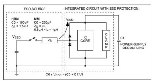 靜電放電強度以電壓形式表示,該電壓由電容的儲能電荷產(chǎn)生,最終傳遞到IC。作用到IC的電壓和電流強度與IC和ESD源之間的阻抗有關(guān)。對電荷來源進行評估后建立了ESD測試模型。